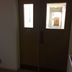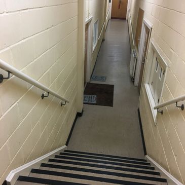 Once inside the building, you go through door to your right and you'll arrive at the stairs and some double doors; head through them, down the steps and you'll find us there on the left.